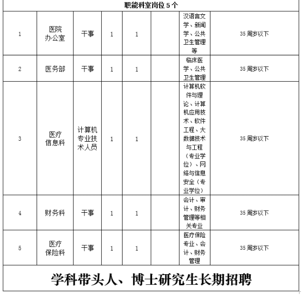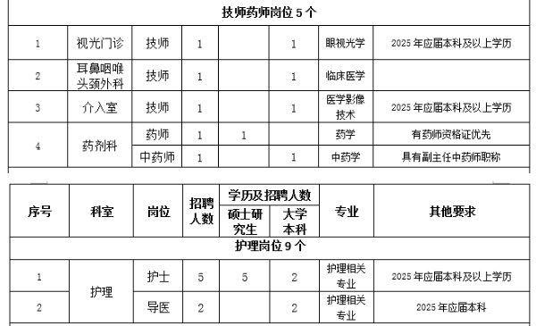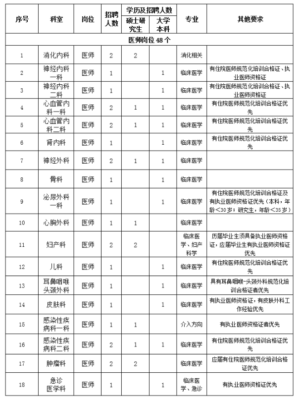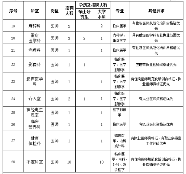 1.思想政治素質(zhì)好,擁護黨的路線(xiàn)、方針、政策。2.遵紀守法,醫德品行良好,有較強的事業(yè)心、責任心和進(jìn)取心。3.身體健康,能滿(mǎn)足應聘崗位需要。4.具備相應的學(xué)歷和學(xué)位,有履行應聘崗位職責的專(zhuān)業(yè)能力、技能條件。5.具有團隊精神,有良好的溝通能力。6.具備應聘崗位所需要的其他條件。7.服從單位安排。