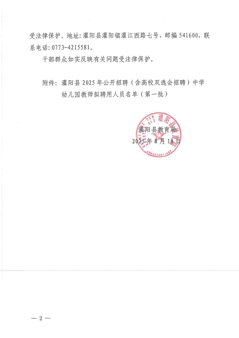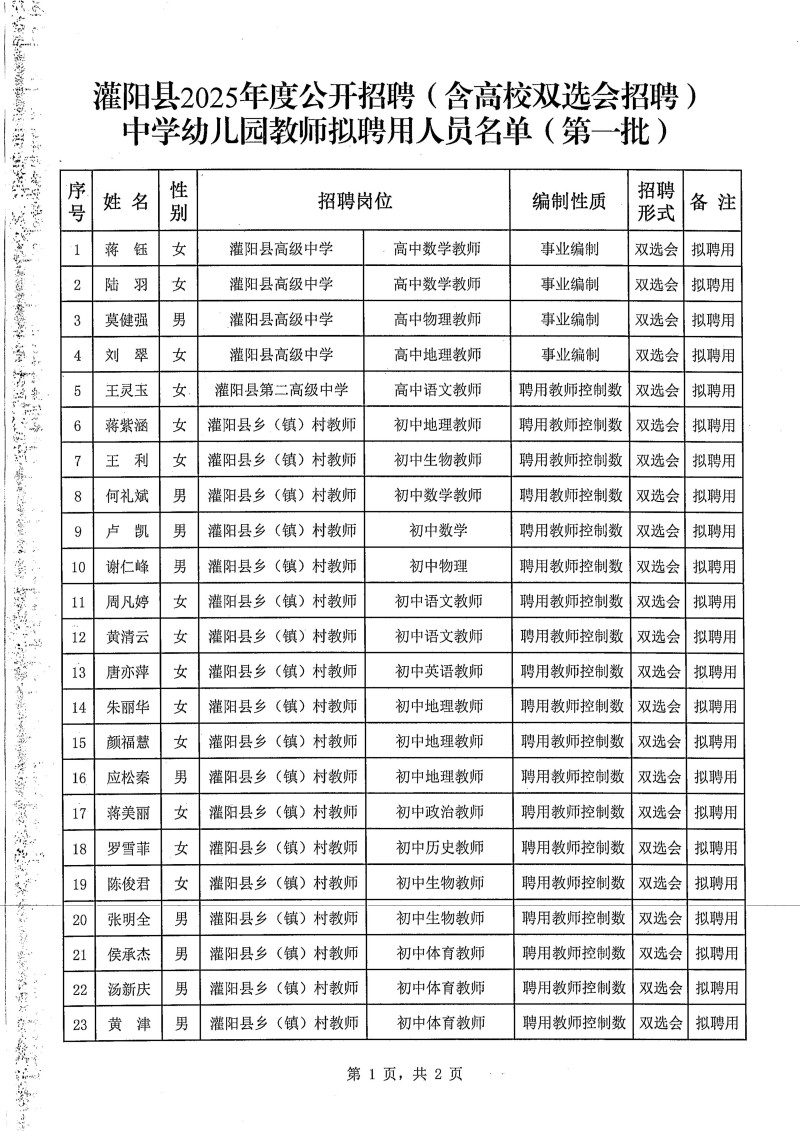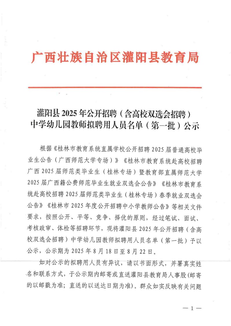 灌陽(yáng)縣2025年公開(kāi)招聘(含高校雙選會(huì )招聘)中學(xué)幼兒園教師擬聘用人員名單(第一批)公示