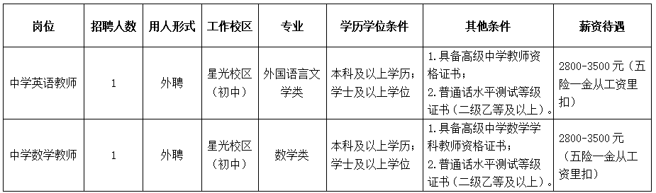 根據學(xué)校工作需要,南寧市第十中學(xué)星光校區(初中部)面向社會(huì )招聘教職工,具體崗位如下: