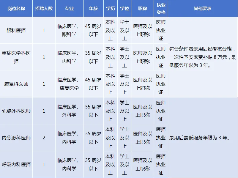 ■ 眼科、康復醫學(xué)科、重癥醫學(xué)科醫師為我院緊缺崗位人才,符合條件錄用者,經(jīng)試用考核合格后可享受安家費補貼。