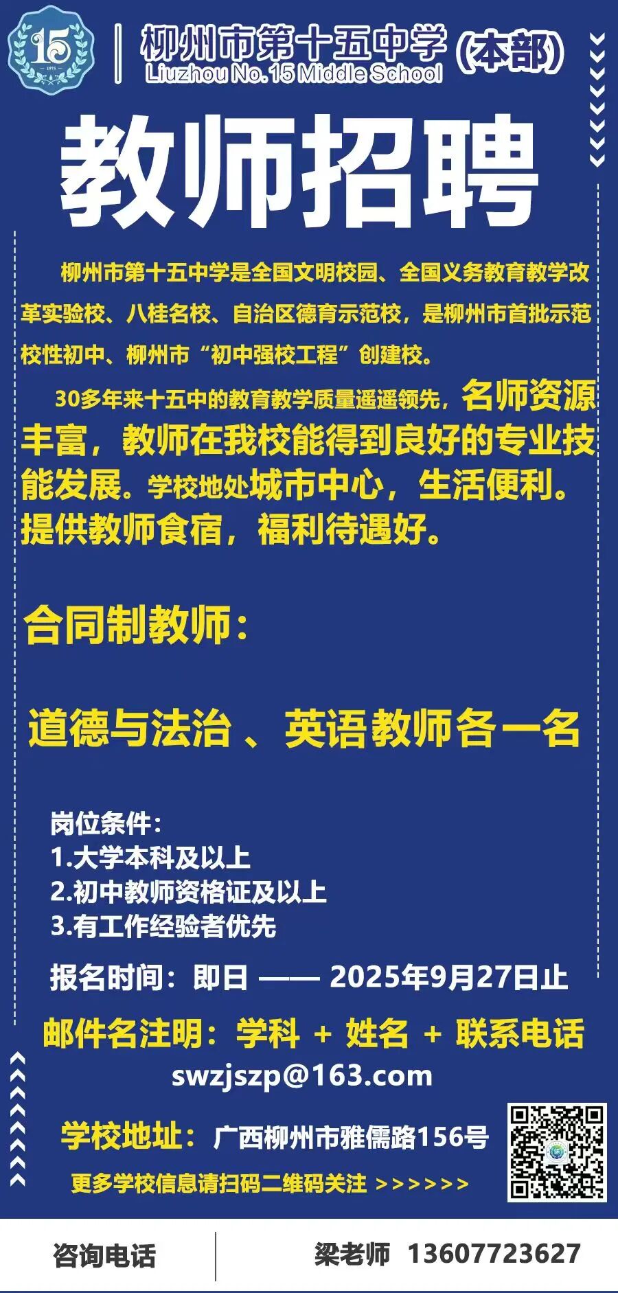 原文標題:柳州市第十五中學(xué)本部招聘公告