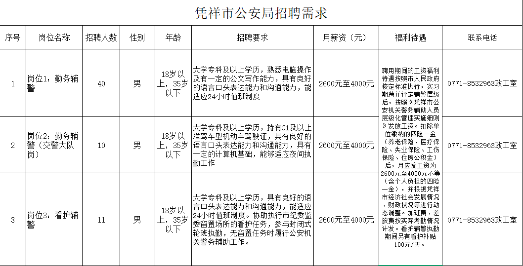 為適應憑祥市公安機關(guān)管理工作發(fā)展需要,憑祥市公安局決定面向社會(huì )公開(kāi)招聘61名警務(wù)輔助人員(以下簡(jiǎn)稱(chēng)輔警)。具體事宜如下: