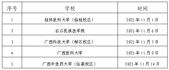 采取現場(chǎng)報名方式的人員請前往桂林醫科大學(xué)、右江民族醫學(xué)院、廣西科技大學(xué)、廣西醫科大學(xué)、廣西中醫藥大學(xué)等區內各院校雙選會(huì )現場(chǎng)進(jìn)行應聘。廣西區內各院校雙選會(huì )舉辦時(shí)間詳見(jiàn)下表。