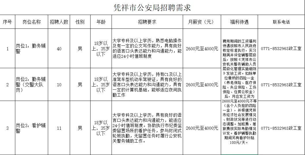 原文標題:共61人!憑祥市公安局2025年面向社會(huì )公開(kāi)招聘警務(wù)輔助人員公告